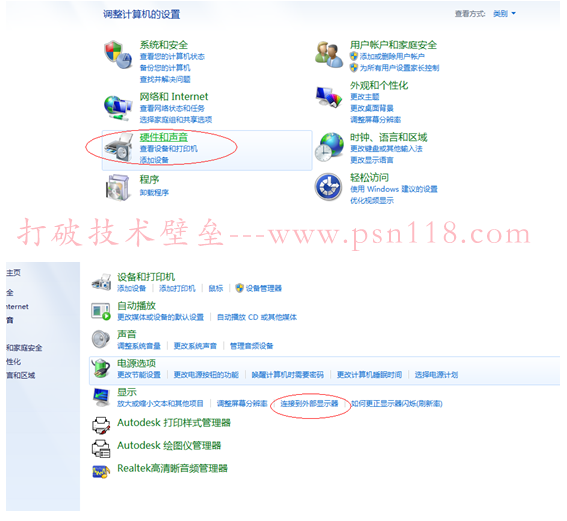 (1)打开“控制面板”,选择“硬件和声音”,再选择“连接到外显示器”.